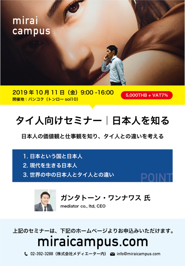 お互いの価値観、またそれに伴う行動の違いを認め合うことが異文化理解の第一歩です。日本人と働き始めたばかりのタイ人からベテランのタイ人まで、今一緒に働く「日本人」について理解を深める場にしていきたいと思っています。