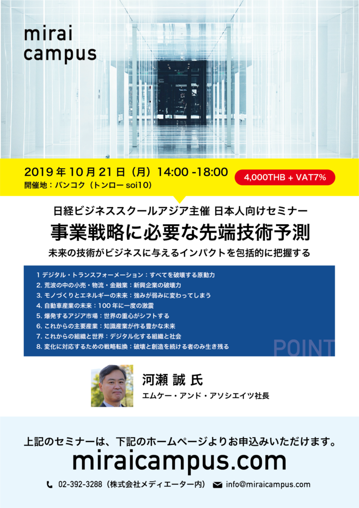 想像以上の速さで変化する未来の中で勝ち残るためには、これからの技術の大きなトレンドを、まずは全体像をもって理解し、そして自社の戦略を転換していかなければなりません。今回、日経ビジネススクール人気講座「事業戦略に必要な15年後の技術予測」を担当する講師が来タイし、将来のビジネスにインパクトを与える、人工知能(AI)やロボットまた自動運転や電気自動車、といった新しい技術最先端の本質と産業へのインパクトを説明し、企業はどう対処すべきかを考えます。