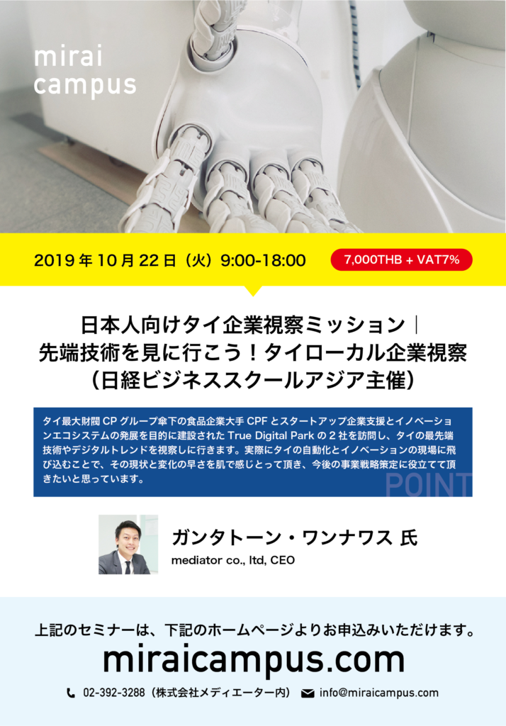 タイ最大財閥CPグループ傘下で通信大手のTrue Corporationが運営する東南アジア最大級のスタートアップ支援施設。2019年9月に第1期分が全面開業したばかりです。第1期開発分では、約5万㎡の敷地面積にスタートアップ向けのコワーキングスペースやイベント会場、レンタルオフィスなどが提供されています。今回の訪問では、入居するITスタートアップ企業の代表者から、タイの先端技術やデジタルトレンドをお伺いします。