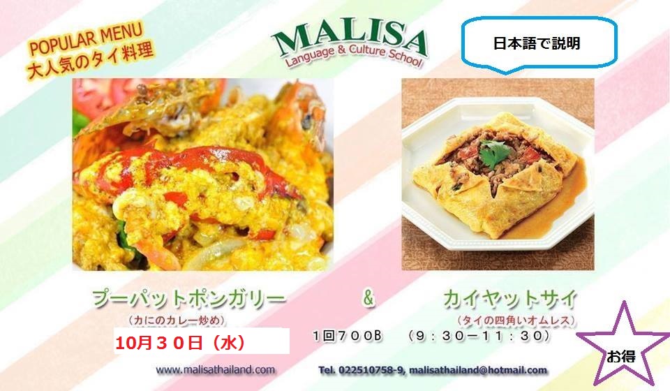広告掲載料金についてはこちら 2019.10.22 語学・習い事 10月30日のタイ料理教室 日本語で教える、楽しく美味しくがモットーのマリサスクールで10月30日0930-1130タイ料理教室のお誘いです。 Tel 022510759 E-mail malisathailand@hotmail.com URL http://www.malisathailand.com/ 投稿者 マリサスクール