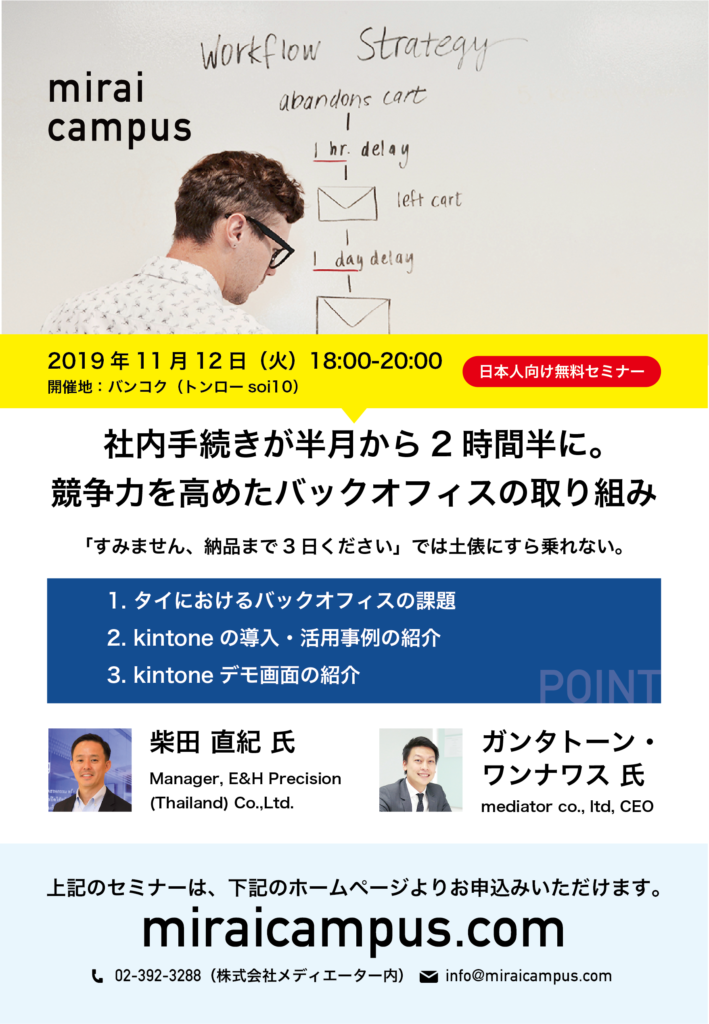 本セミナーでは、webデータベース型の業務アプリ構築クラウドサービス「kintone」を提供するサイボウズ株式会社とアセアン最大規模の切削加工メーカーであり、実際に「kintone」を導入し、社内手続きの大幅短縮に成功したE&H Precision (Thailand) Co.,Ltd. Managerの柴田直紀氏をお招きし、タイにおけるバックオフィスの課題と現場での業務の効率化、また「kintone」の活用事例をご紹介いたします。