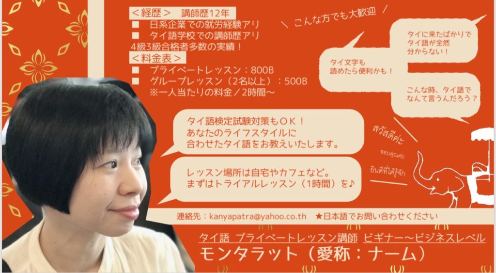経験豊富で明るいモンタラット(愛称ナーム)先生[女性]がタイ語を教えます!