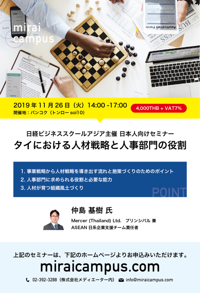 自社の事業戦略に整合する人材戦略を打ち立てるには、自社のビジネスの特徴や戦略を正しく理解し、どんな人材がどれくらい不足しているのか?そのために、どのような採用・育成・異動・後継者管理をするべきか?を詳細に検討する必要があります。本講座では、これらの施策を実行する上で、気をつけたい実務上の留意点や人事部門に求められる対人対応力や分析力などのスキル、施策の定着方法を解説します。組織・人材戦略のコンサルタントとして数々の在タイ日系企業を支援してきた仲島氏から、「現地化」というゴールに向けて整えておくべき人材戦略を学びます。