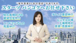 ハワイ進出を皮切りに海外事業歴39年、世界21カ国・34拠点でネットワーク展開する東証一部上場企業の「スターツ」。日本国内では不動産仲介の「ピタットハウス」はあまりにも有名だ。タイの現地法人として 「スターツ・インターナショナル・タイランド」を立ち上げたのが2006年。以来、タイへ進出する企業の案件を中心として、時代とともに多様化するニーズに柔軟に対応してきた。