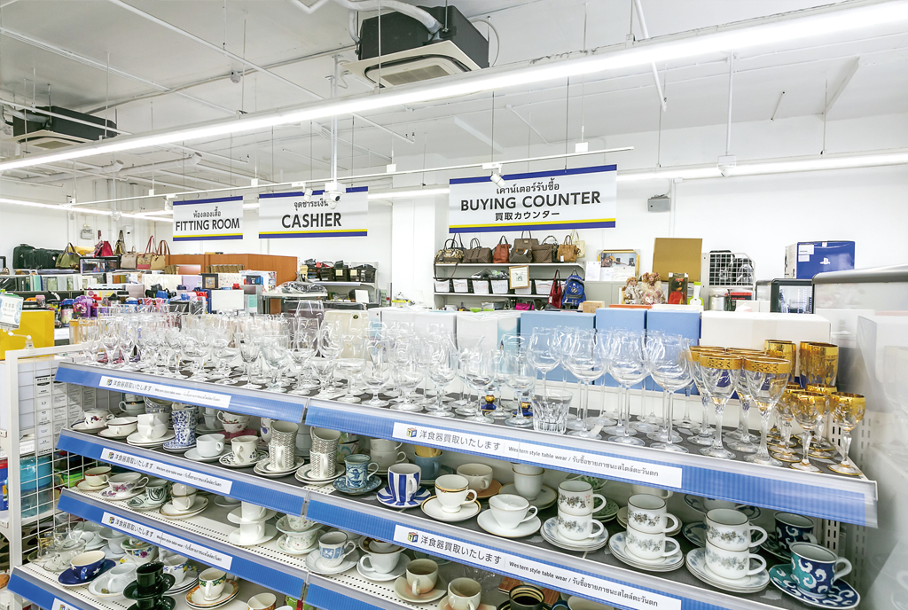店内には日本から輸入する中古雑貨や食器の他、タイ現地で調達した家具、家電、洋服、バッグなどが並ぶ。豊富な品揃えを実現するのは、「あらゆる品を買い取る」という “何でもリユース”の姿勢だ。同社は2016年3月に現地法人「トレジャーファクトリー(タイランド)」を設立して以降、日本や欧米、アジア、アフリカなどの在タイ海外顧客から積極的に良質な中古品の買い取りを実施。加藤大輔マネージャーが「タイでも買い取り文化を普及させたい」と意気込む通り、サービス面でも日本同様の出張買い取りと宅配サービスを行っている。