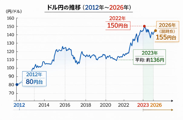 2012年頃は80円台、2022年は150円台、2023年の平均は約136円という年もありました。