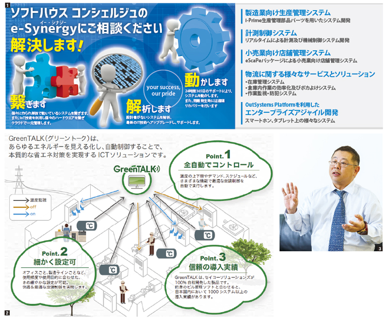 - ①同社が提供する各種サービス。かゆいところに手がとどく“ソフトハウス・コンシェルジュのe-Synergy”が同社の理念でもある