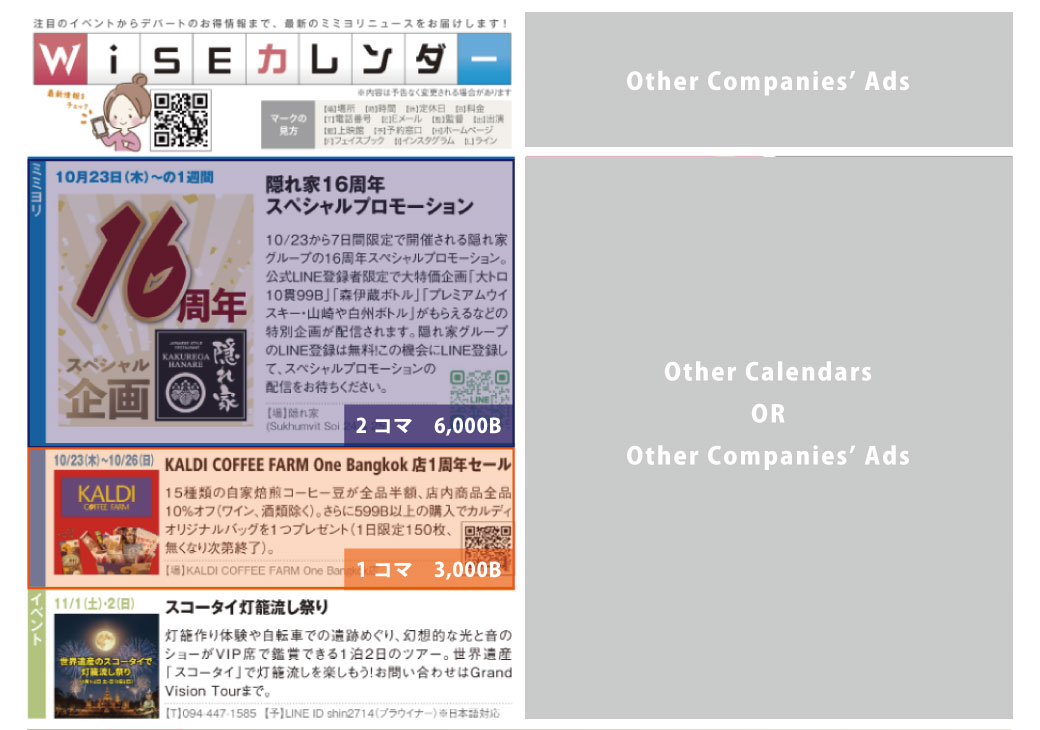 This is the advertising rate for placement in the popular “WiSE Calendar” section of the Weekly WiSE magazine. Your listing will also appear on the web-based WiSE Digital “Traveling Calendar (Odekake Calendar).” *The “Traveling Calendar” is distributed once a week via the WiSE’s official LINE account.| WiSE Calendar Placement (2 slots) |