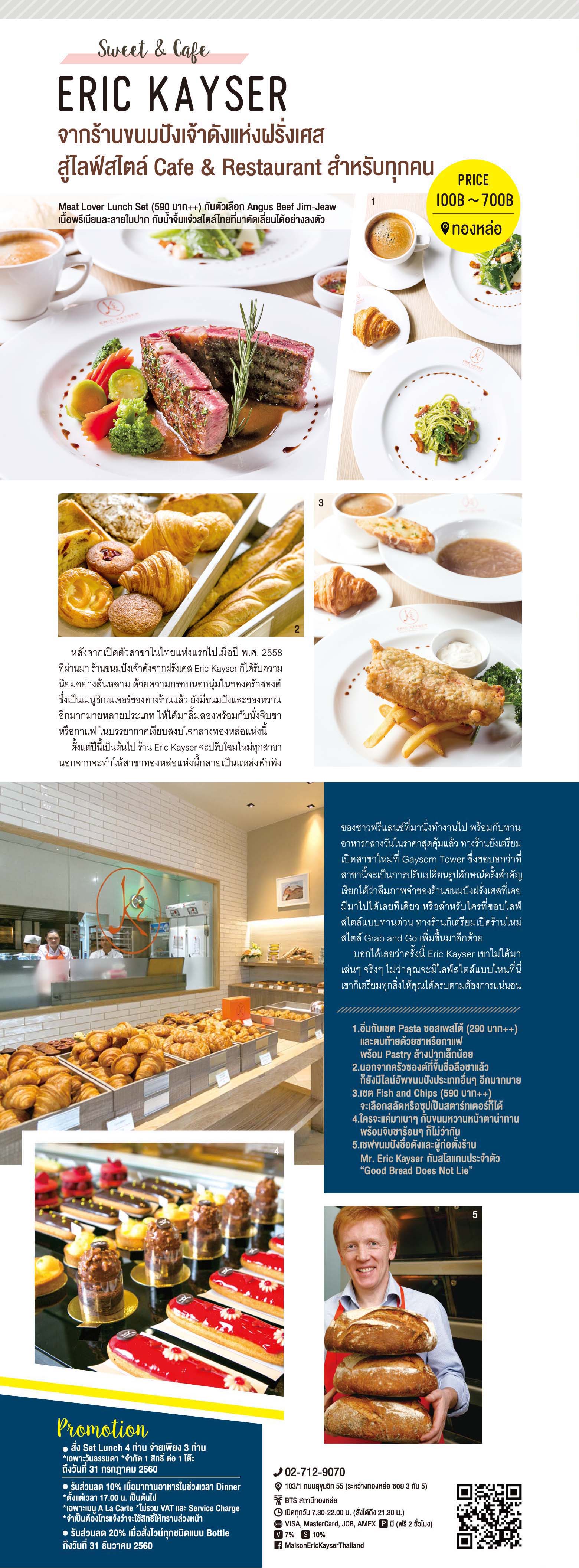 หลังจากเปิดตัวสาขาในไทยแห่งแรกไปเมื่อปี พ.ศ. 2558 ที่ผ่านมา ร้านขนมปังเจ้าดังจากฝรั่งเศส Eric Kayser ก็ได้รับความนิยมอย่างล้นหลาม ด้วยความกรอบนอกนุ่มในของครัวซองต์ซึ่งเป็นเมนูซิกเนเจอร์ของทางร้านแล้ว ยังมีขนมปังและของหวานอีกมากมายหลายประเภท ให้ได้มาลิ้มลองพร้อมกับนั่งจิบชาหรือกาแฟ ในบรรยากาศเงียบสงบใจกลางทองหล่อแห่งนี้ตั้งแต่ปีนี้เป็นต้นไป ร้าน Eric Kayser จะปรับโฉมใหม่ทุกสาขานอกจากจะทำให้สาขาทองหล่อแห่งนี้กลายเป็นแหล่งพักพิงของชาวฟรีแลนซ์ที่มานั่งทำงานไป พร้อมกับทานอาหารกลางวันในราคาสุดคุ้มแล้ว ทางร้านยังเตรียมเปิดสาขาใหม่ที่ Gaysorn Tower ซึ่งขอบอกว่าที่สาขานี้จะเป็นการปรับเปลี่ยนรูปลักษณ์ครั้งสำคัญเรียกได้ว่าลืมภาพจำของร้านขนมปังฝรั่งเศสที่เคยมีมาไปได้เลยทีเดียว หรือสำหรับใครที่ชอบไลฟ์สไตล์แบบทานด่วน ทางร้านก็เตรียมเปิดร้านใหม่สไตล์ Grab and Go เพิ่มขึ้นมาอีกด้วย บอกได้เลยว่าครั้งนี้ Eric Kayser เขาไม่ได้มาเล่นๆ จริงๆ ไม่ว่าคุณจะมีไลฟ์สไตล์แบบไหนที่นี่เขาก็เตรียมทุกสิ่งให้คุณได้ครบตามต้องการแน่นอน