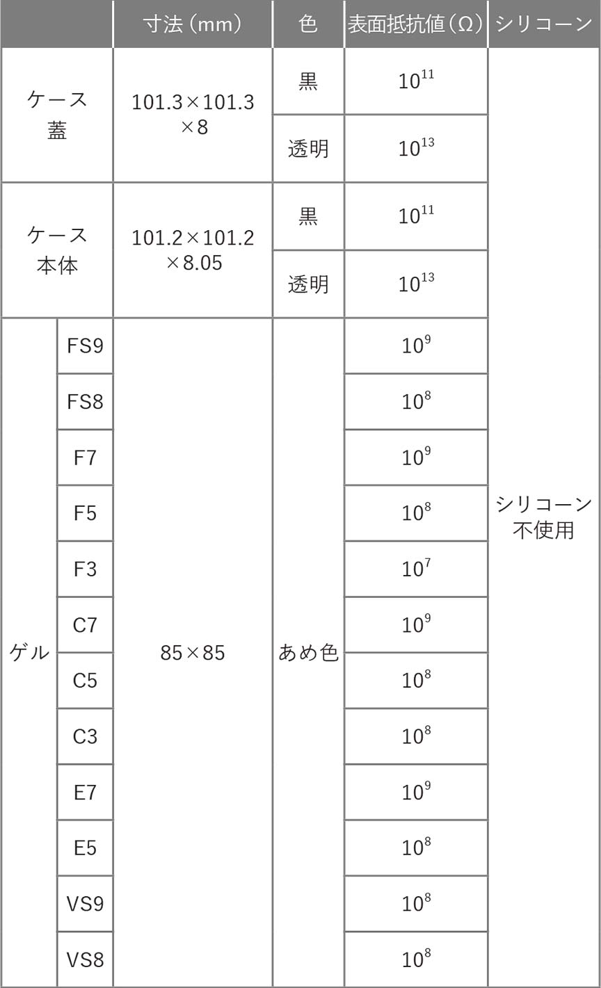 10⁷~10⁹程度の表面抵抗値があり、半導体や電子部品の静電破壊を防ぐ。(※表面抵抗値はゲルの値)