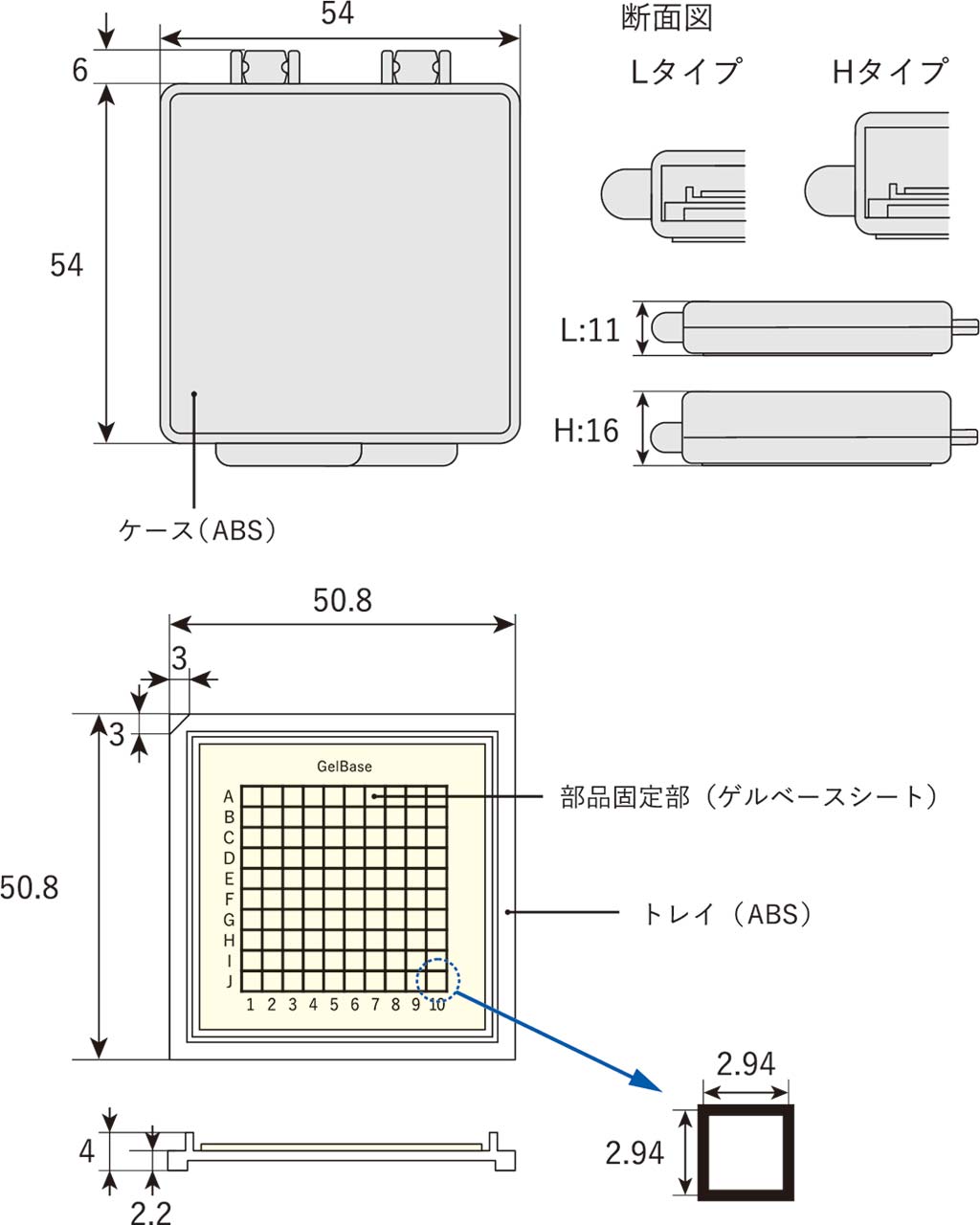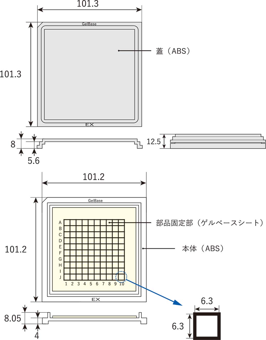 ゲルベース®は完全ノンシリコーン仕様の精密部品搬送ケース。精密部品や半導体パーツなどの搬送時、振動や衝撃から保護。材料にはシリコーンや粘着剤は使用しておらず、転写の心配もなし。