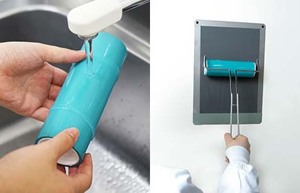 汚れによって粘着力が低下したときは、水洗いまたは転写シート(Dクイック)へ転写することで繰り返し使用することが可能。水洗いの場合は流水にあてながら優しくこすることで汚れが落ち、乾くと粘着力が復活する。Dクイックを使用する場合はローラーをDクイックの上から下まで2回転がすことで、ローラーに付着した汚れの90%以上を転写できる。