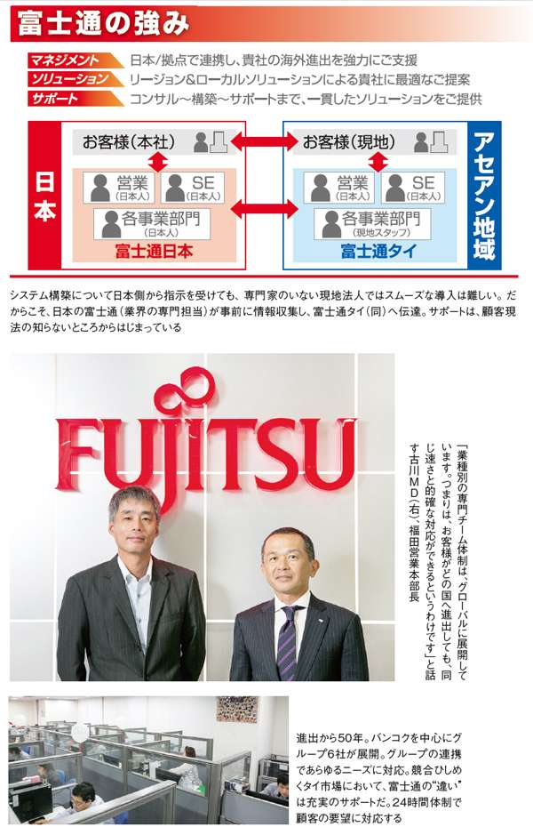 一方タイ現地法人の多くは、ITの専門家が不在だ。そこで同社では、事前に日本本社へ(日本の)富士通の営業とエンジニアが訪問し、日本の社内システムや現法に導入させたいシステム要件などを聞き、富士通タイへ引き継ぐ。しかも同社(日本とタイ)では、社内体制を製造、流通、金融、官公庁といった業種別の専門チームに分けているという。「互いに業界の専門家である日タイの富士通同士で情報共有し、その後、現法(現場)の声を聞きに行くことで、最適な提案が短期間でできます」(古川MD)。