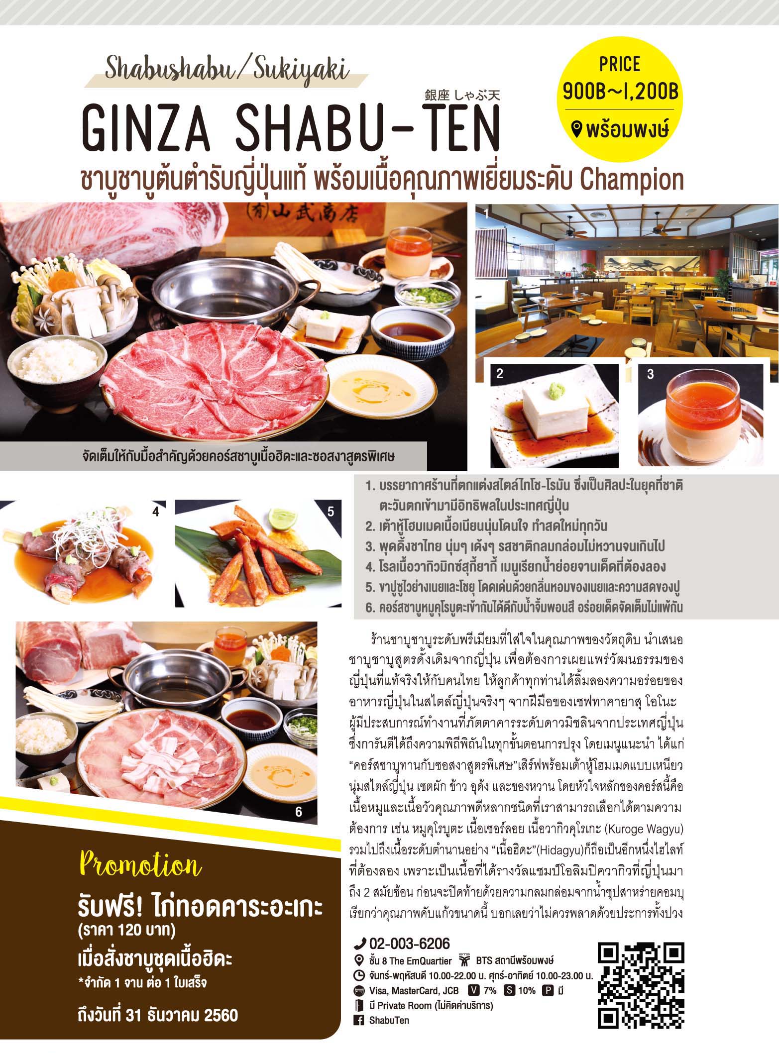 ร้านชาบูชาบูระดับพรีเมียมที่ใส่ใจในคุณภาพของวัตถุดิบ นำเสนอชาบูชาบูสูตรดั้งเดิมจากญี่ปุ่น เพื่อต้องการเผยแพร่วัฒนธรรมของญี่ปุ่นที่แท้จริงให้กับคนไทย ให้ลูกค้าทุกท่านได้ลิ้มลองความอร่อยของอาหารญี่ปุ่นในสไตล์ญี่ปุ่นจริงๆ จากฝีมือของเชฟทาคายาสุ โอโนะ ผู้มีประสบการณ์ทำงานที่ภัตตาคารระดับดาวมิชลินจากประเทศญี่ปุ่น ซึ่งการันตีได้ถึงความพิถีพิถันในทุกขั้นตอนการปรุง โดยเมนูแนะนำ ได้แก่ “คอร์สชาบูทานกับซอสงาสูตรพิเศษ”เสิร์ฟพร้อมเต้าหู้โฮมเมดแบบเหนียวนุ่มสไตล์ญี่ปุ่น เซตผัก ข้าว อุด้ง และของหวาน โดยหัวใจหลักของคอร์สนี้คือเนื้อหมูและเนื้อวัวคุณภาพดีหลากชนิดที่เราสามารถเลือกได้ตามความต้องการ เช่น หมูคุโรบูตะ เนื้อเซอร์ลอย เนื้อวากิวคุโรเกะ (Kuroge Wagyu)รวมไปถึงเนื้อระดับตำนานอย่าง “เนื้อฮิดะ”(Hidagyu)ก็ถือเป็นอีกหนึ่งไฮไลท์ที่ต้องลอง เพราะเป็นเนื้อที่ได้รางวัลแชมป์โอลิมปิควากิวที่ญี่ปุ่นมาถึง 2 สมัยซ้อน ก่อนจะปิดท้ายด้วยความกลมกล่อมจากน้ำซุปสาหร่ายคอมบุเรียกว่าคุณภาพคับแก้วขนาดนี้ บอกเลยว่าไม่ควรพลาดด้วยประการทั้งปวง