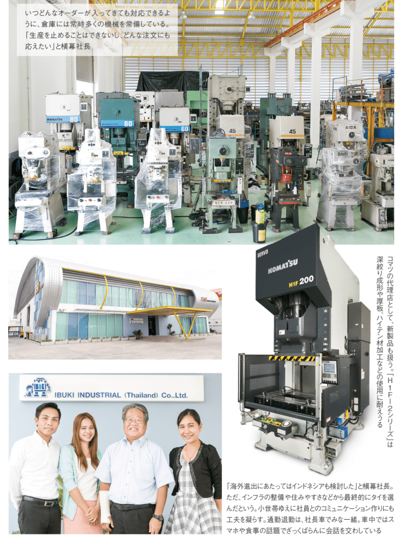 プレス加工機と工作機械の専門商社として1963年に大阪で創業。半世紀後に海外初拠点としてタイ進出を決めたのが、プレス加工機から板金、工作機械の新品及び中古品を扱う伊吹産業だ。タイ現地法人「伊吹産業(タイランド)」は2014年10月に設立。日系自動車関連企業を顧客の中核としながら、大型投資には慎重なタイローカル企業向けに中古品の需要がないか、声がけ営業も展開している。社是は「知識を高め、知識を活かし、一流の商品、一流の市場を獲得し、一流の専門商社を目指す」。大手プレス加工機メーカーで務めていた豊富な経験を持つ横幕久治タイ法人社長の下、スタッフも日夜、機械の知識を深めている。これまでタイ進出のきっかけは2度あった。1度目は1980年代後半、家電業界が海外工場を建て始めたころ。誘いはあったが「海外なんて考えられない時代だった」と横幕社長は振り返る。自動車部品関連を中心に産業が集積を重ねた今回は、顧客の多くがすでにタイに工場を構えていたということもあり、事業方針にも掲げる「日本の製造業を蘇らせるために支援させていただく」を胸に進出を決めた。 「プレス加工機、工作機械など工場回りの機械設備はオーダーメイドが基本」と話す横幕社長。このため、受注を受けてからの調達が基本となるが、中古品の需要にも備えて倉庫には常時、機械をストックしている。当面はネットワークづくりと知名度の上昇が急務の課題。横幕社長は、立ち上げと同時に採用したタイ人の男性社員と二人三脚で得意先回りを続けている。「私の仕事ぶりを見て、仕事を覚えてほしい」と期待を込めた。