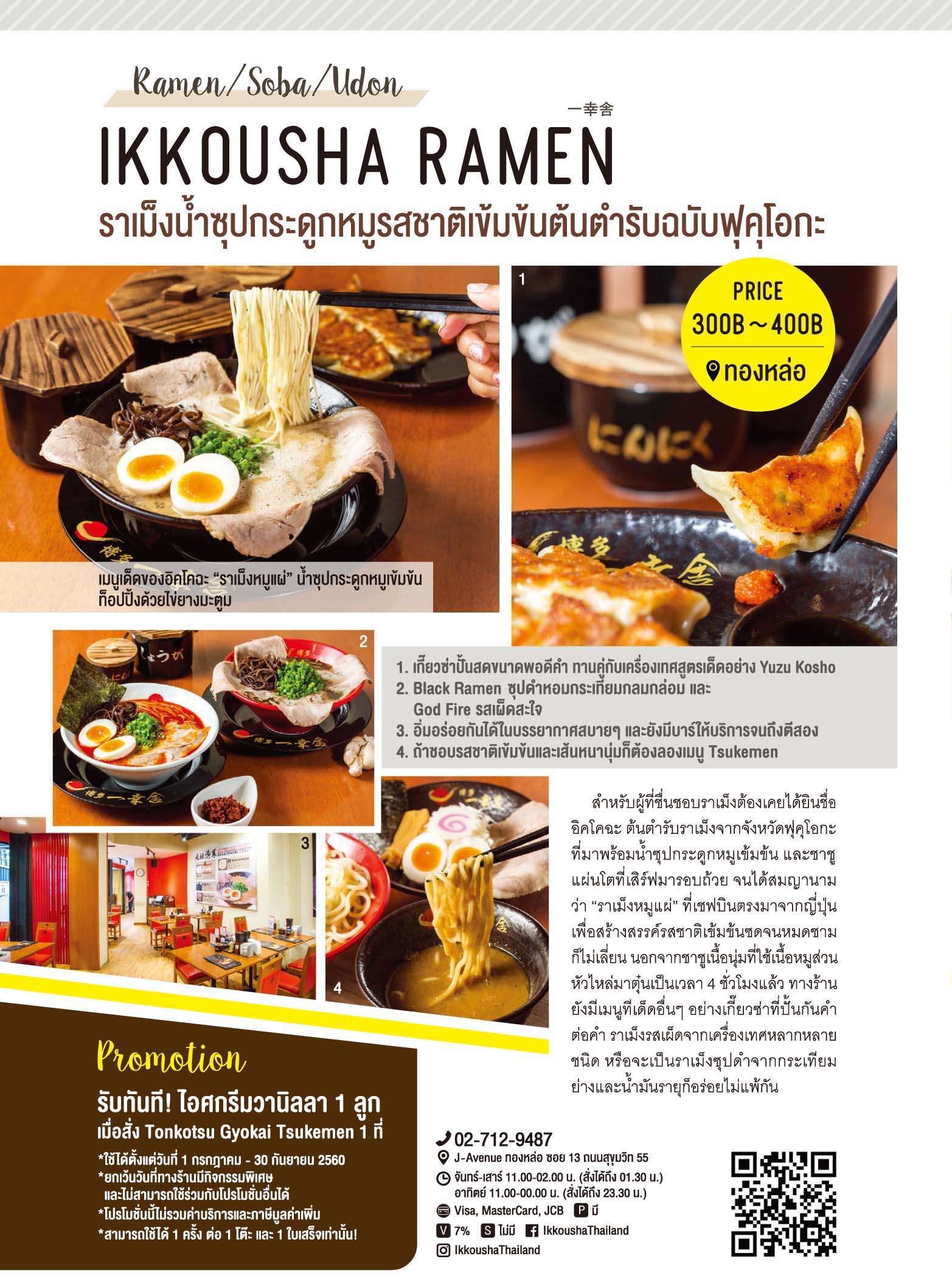สำหรับผู้ที่ชื่นชอบราเม็งต้องเคยได้ยินชื่ออิคโคฉะ ต้นตำรับราเม็งจากจังหวัดฟุคุโอกะที่มาพร้อมน้ำซุปกระดูกหมูเข้มข้น และชาชูแผ่นโตที่เสิร์ฟมารอบถ้วย จนได้สมญานามว่า “ราเม็งหมูแผ่” ที่เชฟบินตรงมาจากญี่ปุ่น เพื่อสร้างสรรค์รสชาติเข้มข้นซดจนหมดชามก็ไม่เลี่ยน นอกจากชาชูเนื้อนุ่มที่ใช้เนื้อหมูส่วนหัวไหล่มาตุ๋นเป็นเวลา 4 ชั่วโมงแล้ว ทางร้านยังมีเมนูทีเด็ดอื่นๆ อย่างเกี๊ยวซ่าที่ปั้นกันคำต่อคำ ราเม็งรสเผ็ดจากเครื่องเทศหลากหลายชนิด หรือจะเป็นราเม็งซุปดำจากกระเทียมย่างและน้ำมันรายุก็อร่อยไม่แพ้กัน