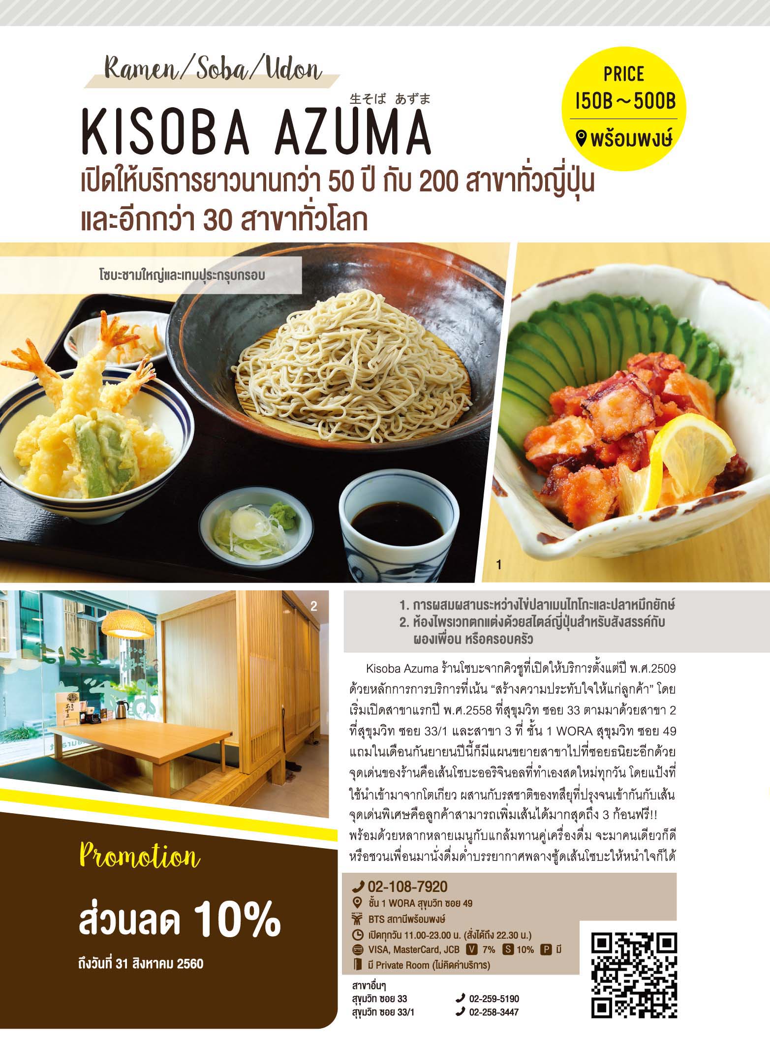Kisoba Azuma ร้านโซบะจากคิวชูที่เปิดให้บริการตั้งแต่ปี พ.ศ.2509 ด้วยหลักการการบริการที่เน้น “สร้างความประทับใจให้แก่ลูกค้า” โดยเริ่มเปิดสาขาแรกปี พ.ศ.2558 ที่สุขุมวิท ซอย 33 ตามมาด้วยสาขา 2