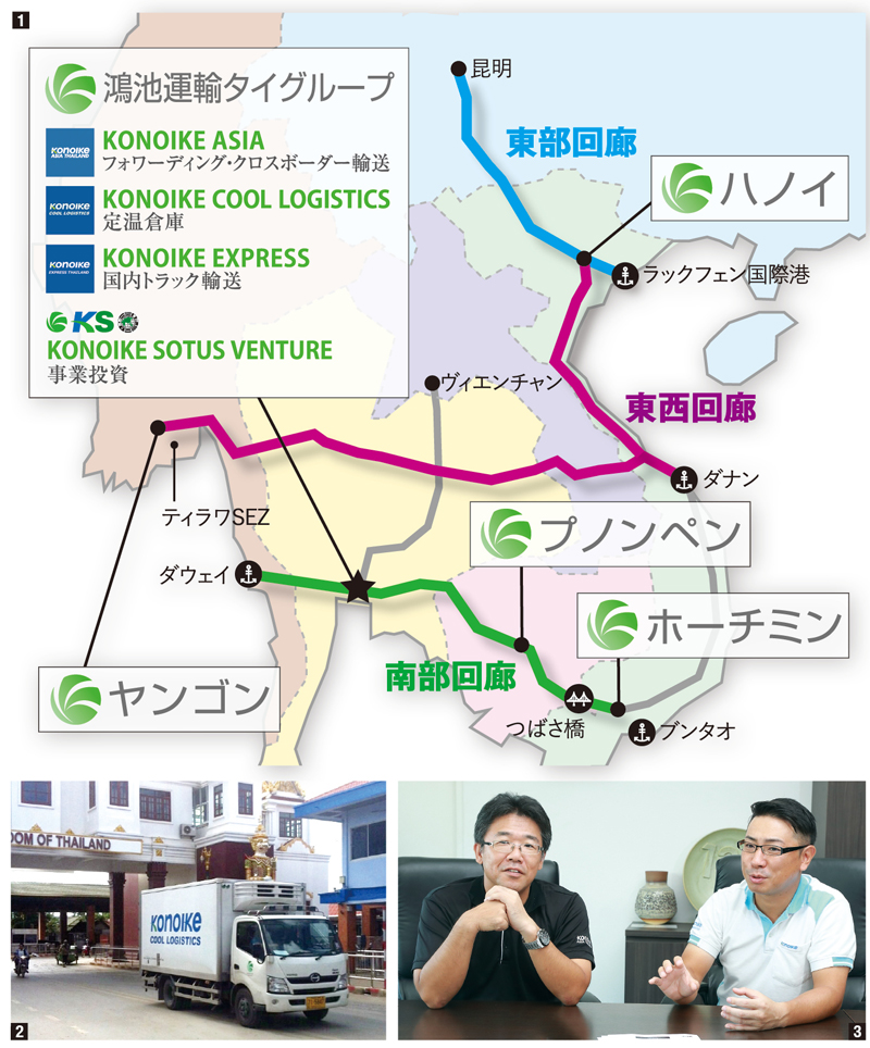- ②「食品や医薬品といった温度管理の必要なモノは多品種です。すでに多くの実績を積ませてもらっています」と自信を見せる定温倉庫と国内配送が専門のKONOIKE COOLの井上代表(右)。「近いうちに、北海道からバンコクへの直行便での生鮮輸送や、近い将来はラオスにも鮮魚を運べるようチャレンジします」と語るフォワーディングとクロスボーダーを担当するKONOIKE ASIAの村上代表。※写真左は冷凍加工食品のクロスボーダー輸送