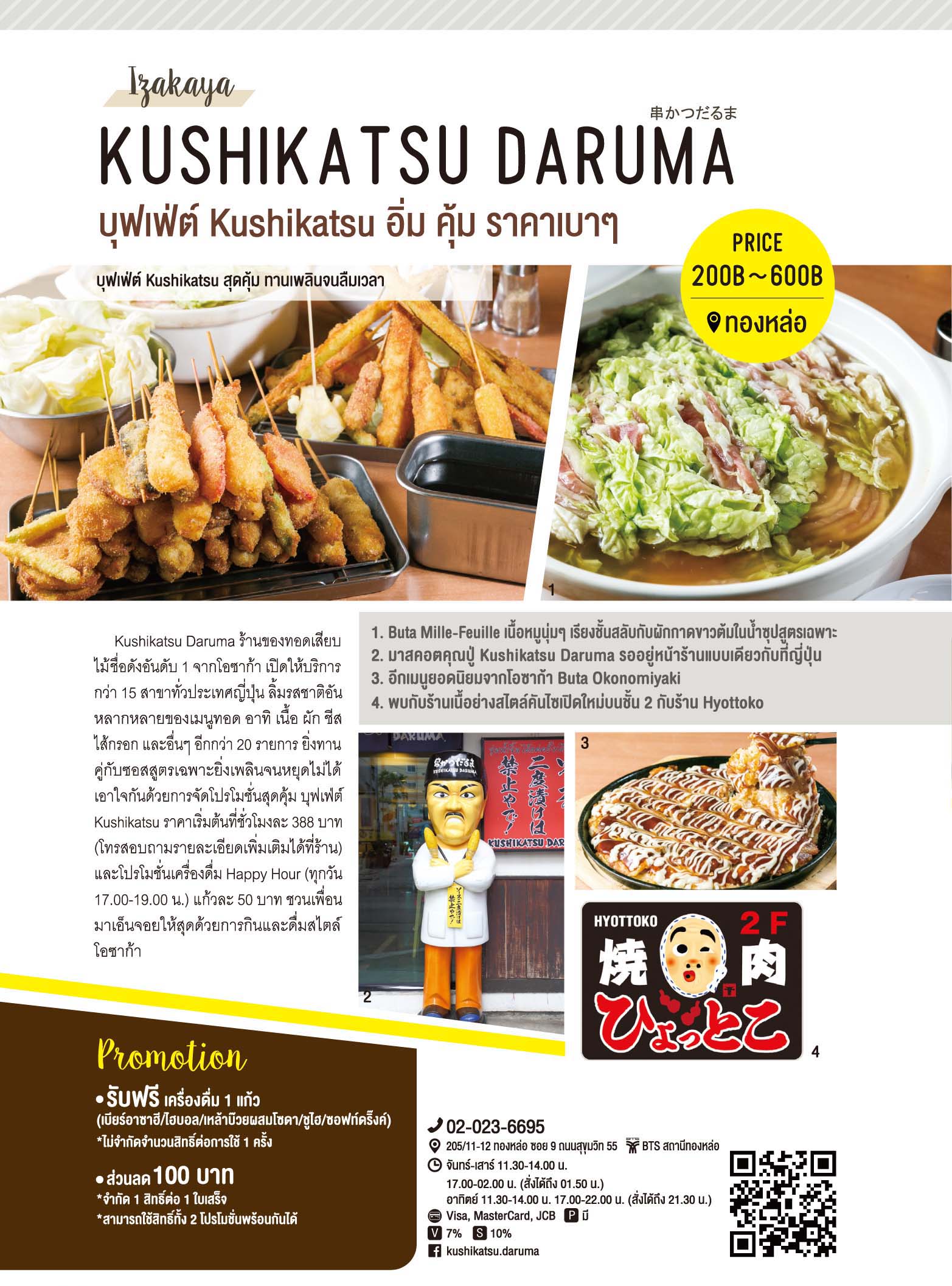 Kushikatsu Daruma ร้านของทอดเสียบไม้ชื่อดังอันดับ 1 จากโอซาก้า เปิดให้บริการ กว่า 15 สาขาทั่วประเทศญี่ปุ่น ลิ้มรสชาติอันหลากหลายของเมนูทอด อาทิ เนื้อ ผัก ชีส ไส้กรอก และอื่นๆ อีกกว่า 20 รายการ ยิ่งทานคู่กับซอสสูตรเฉพาะยิ่งเพลินจนหยุดไม่ได้ เอาใจกันด้วยการจัดโปรโมชั่นสุดคุ้ม บุฟเฟ่ต์ Kushikatsu ราคาเริ่มต้นที่ชั่วโมงละ 388 บาท (โทรสอบถามรายละเอียดเพิ่มเติมได้ที่ร้าน) และโปรโมชั่นเครื่องดื่ม Happy Hour (ทุกวัน 17.00-19.00 น.) แก้วละ 50 บาท ชวนเพื่อนมาเอ็นจอยให้สุดด้วยการกินและดื่มสไตล์โอซาก้า