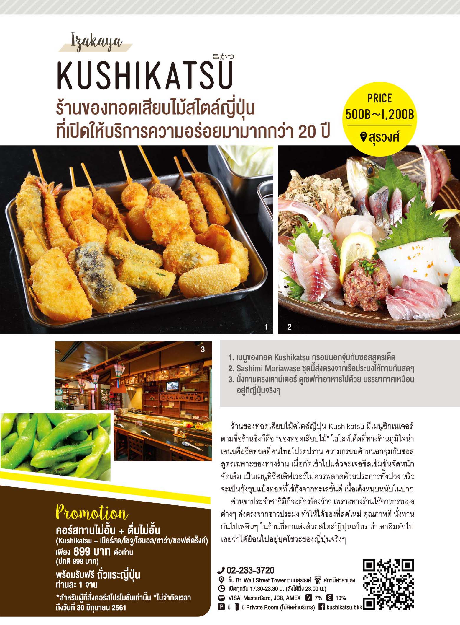 ร้านของทอดเสียบไม้สไตล์ญี่ปุ่น Kushikatsu มีเมนูซิกเนเจอร์ตามชื่อร้านซึ่งก็คือ “ของทอดเสียบไม้” ไฮไลท์เด็ดที่ทางร้านภูมิใจนำเสนอคือชีสทอดที่คนไทยโปรดปราน ความกรอบด้านนอกจุ่มกับซอสสูตรเฉพาะของทางร้าน เมื่อกัดเข้าไปแล้วจะเจอชีสเข้มข้นจัดหนักจัดเต็ม เป็นเมนูที่ชีสเลิฟเวอร์ไม่ควรพลาดด้วยประการทั้งปวง หรือจะเป็นกุ้งชุบแป้งทอดที่ใช้กุ้งจากทะเลชั้นดี เนื้อเด้งหนุบหนับในปาก ส่วนขาประจำซาชิมิก็จะต้องร้องว้าว เพราะทางร้านใช้อาหารทะเลต่างๆ ส่งตรงจากชาวประมง ทำให้ได้ของที่สดใหม่ คุณภาพดี นั่งทานกันไปเพลินๆ ในร้านที่ตกแต่งด้วยสไตล์ญี่ปุ่นเรโทร ทำเอาลืมตัวไปเลยว่าได้ย้อนไปอยู่ยุคโชวะของญี่ปุ่นจริงๆ