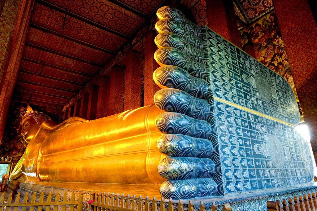 1788年、ラマ1世によって建てられたバンコク最古の寺院。「涅槃寺」とも呼ばれており、本堂内には全長46m、高さ15mの黄金の涅槃仏が横たわります。仏像の足裏には仏教の世界観を現した108の図が描かれているので、その美しい螺鈿細工は必見です。