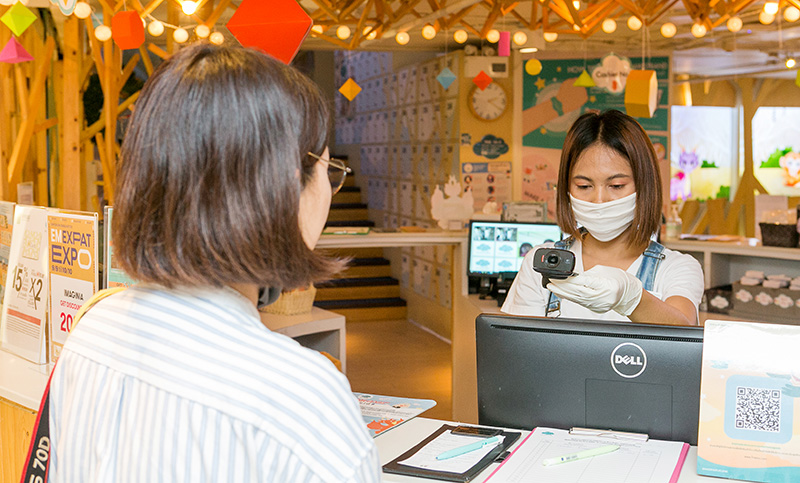 入館時には受付で検温&アルコール除菌、そして顔写真の撮影や連絡先の登録などコロナ&セキュリティ対策も万全。