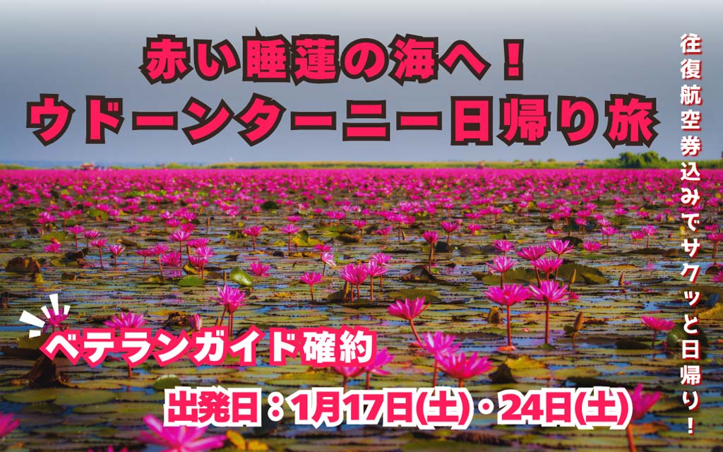 1月10日(土)・24日(土)出発日は、パンダバス在籍20年以上のベテランガイドがご案内いたします。 タイ東北部・ウドーンターニー県の湖では、毎年1月から2月にかけて無数の赤い睡蓮が水面を埋め尽くし、まるで夢の中に迷い込んだような幻想的な光景が広がります。その美しさは息をのむほどで、タイにお住まいの方にはぜひ一度訪れていただきたい絶景スポットです♪