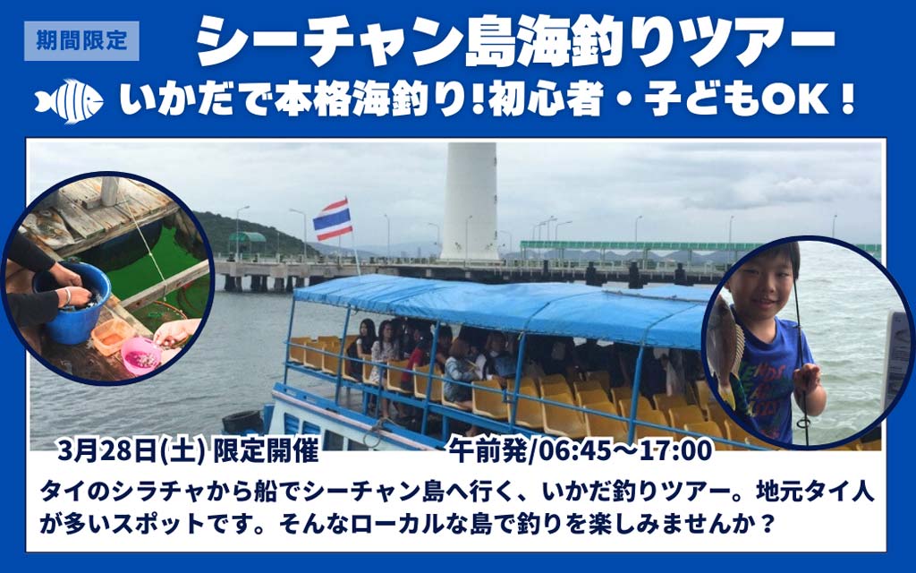 タイのシラチャから船でシーチャン島へ行く、いかだ釣りツアー。地元タイ人が多いスポットです。そんなローカルな島で釣りを楽しみませんか?初めての方でもスタッフの方より教えてもらえるので安心です。