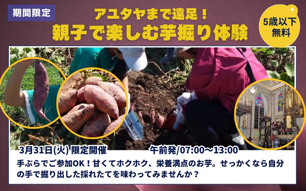 甘くてホクホク、栄養満点のおいも。せっかくなら自分の手で掘り出した採れたてを味わってみませんか?芋ほりが出来るアユタヤの畑までは車で約1時間半。農家の方が丹精こめて育てたサツマイモ、どんな形のサツマイモが掘れるかはお楽しみ♪