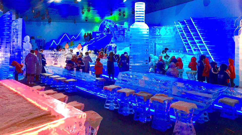 氷点下10〜30℃に保たれたドーム内には、カウンターや椅子がすべて氷で作られたバーや、氷でできたスライダーやかまくら遊んだり、記念撮影ができたりと非日常体験できます。