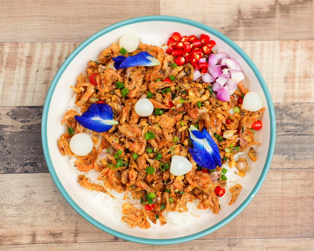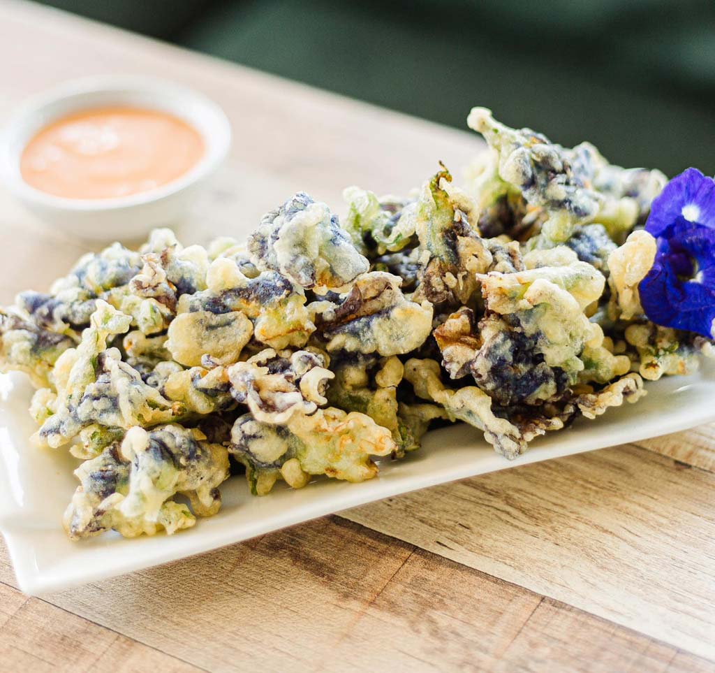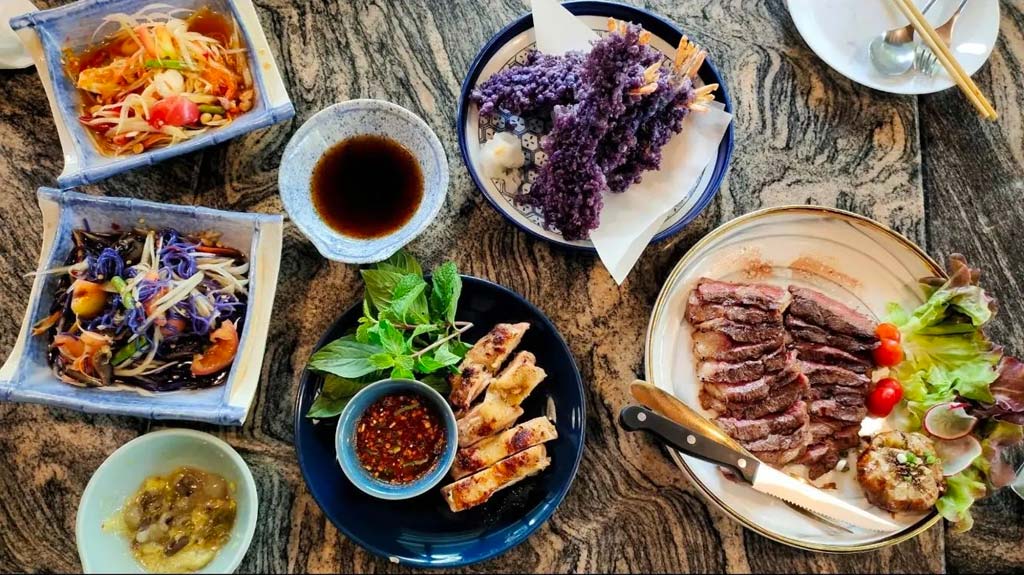 イサーン料理と居酒屋料理のフュージョン料理、さらにはバタフライピーを使ったメニューを提供する珍しいお店。最も目を引くのは、紫色の麺という衝撃的なビジュアルの「エビとバタフライピーの春雨サラダ」。バタフライピーを使った青いエビのてんぷらもぜひ頼んでみたい1品です。