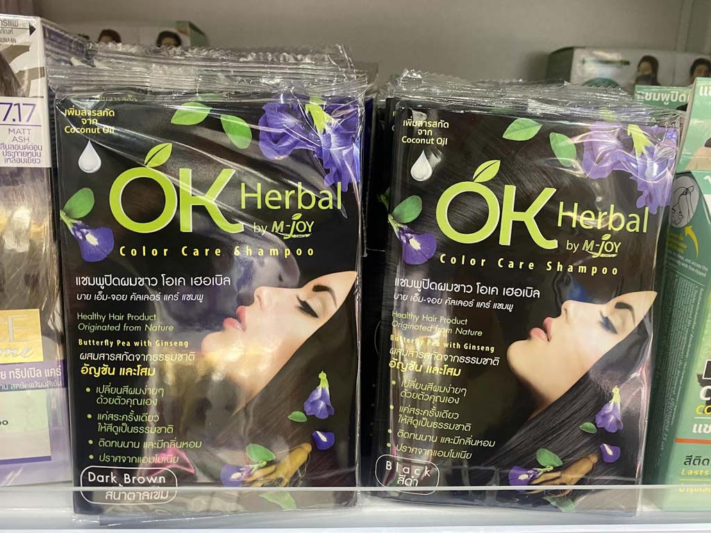 白髪を自然な黒に染める、使いきりタイプのシャンプーです。毛量が多いロングの方は2袋使いがおすすめ。価格はドラッグストア「Boots」で1袋50B前後。
