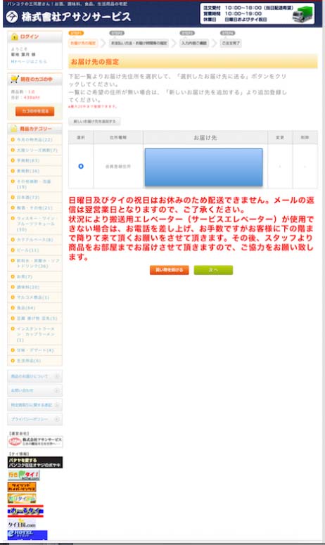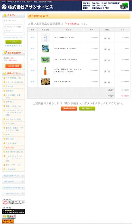 - 配送料は30B(350B以上の購入で送料無料)、お酒の配送料は350B〜