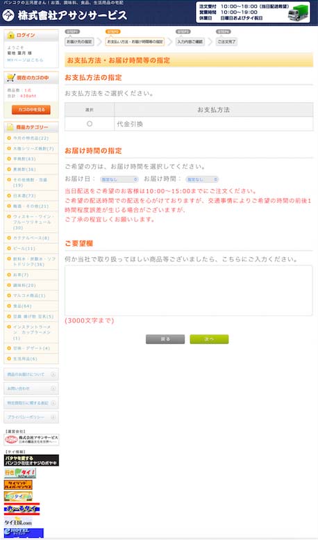 支払い方法の「代引」を選択、配達日と配達時間の指定をする