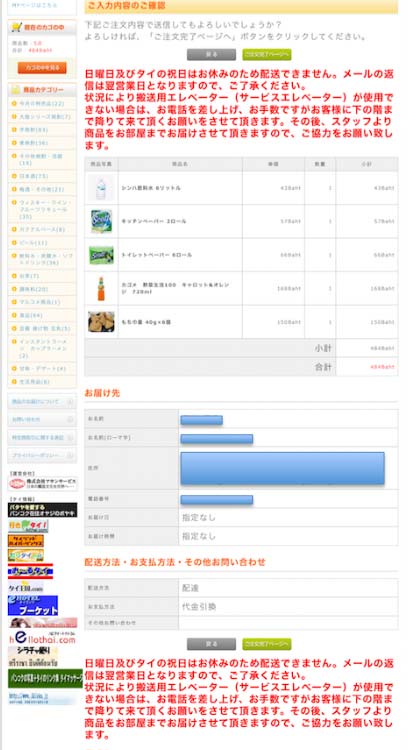 ※サムイ島、ランタ島、チャーン島、メーホンソン県、ナラティーワート県、ヤラー県、パッタニー県は追加料金100B、パンガン島は特別パッキングが必要なため追加料金200B - 配達希望日+翌日の2日間の在宅必須(配達時間の指定は不可)