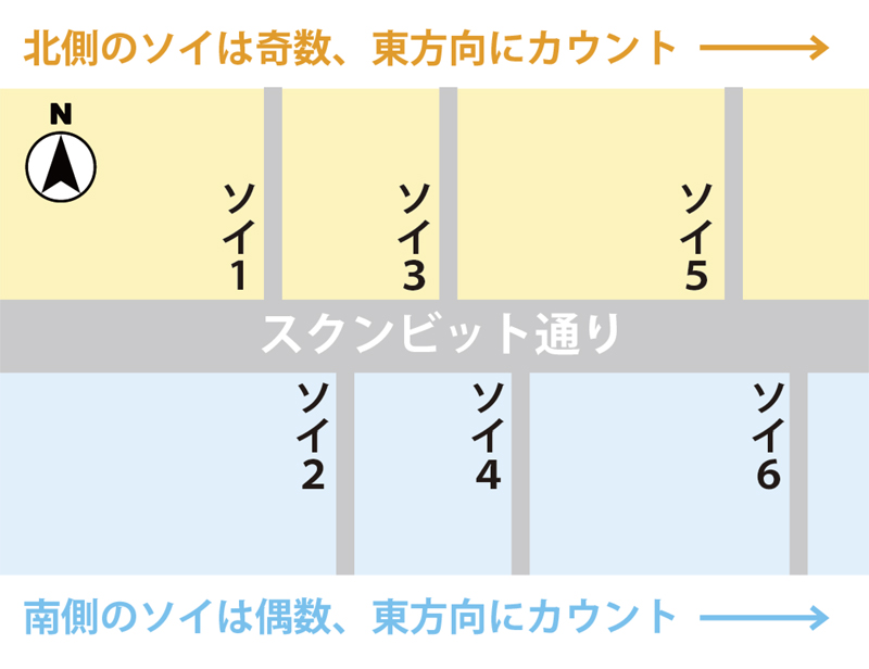 タイでは小路を「Soi(ソイ)」と呼び、バンコクの中心部を東西に貫くスクンビット通りがあります。この大通りの北側に奇数のソイが延び、南側に偶数のソイが延びており、通り名を指すときには「スクンビット・ソイ23」などと表すので覚えておきましょう。
