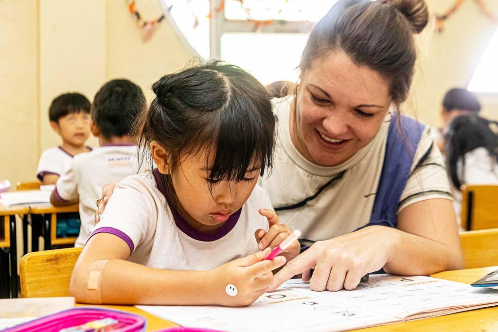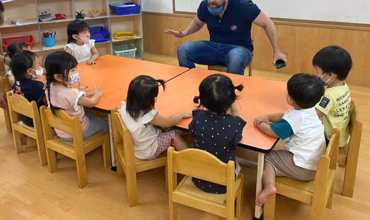 様々な国籍の教師が保育に関わります。日本人部でもネイティブ講師による英語の時間を採用しています。