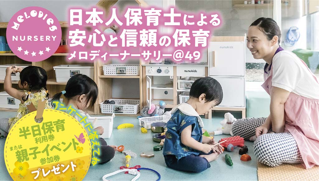 メロディー幼稚園が運営する未就園児のためのサービスがRQ49 Mallで「メロディーナーサリー」として2024年5月にオープン。本園のメロディー幼稚園38キャンパスも以前と同様にナーサリー(保育園)は利用可能です。両キャンパス共に、日本人保育士による安心保育。食育にこだわった給食や、GPS搭載の園バスも好評。