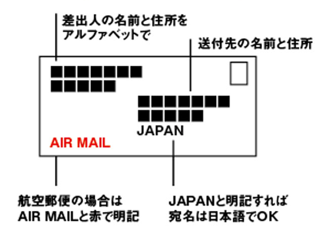 手紙やはがきに、書籍などのかさばらないものを日本へ送る場合は国際通常郵便を使います。宛先には「JAPAN」「AIR MAIL」とアルファベットで目立つように記入してください。郵便番号や都道府県などは日本語で記入しても大丈夫です。また、確実に送るためにはポスト投函ではなく、直接郵便局の窓口で手続きすることをおすすめします。