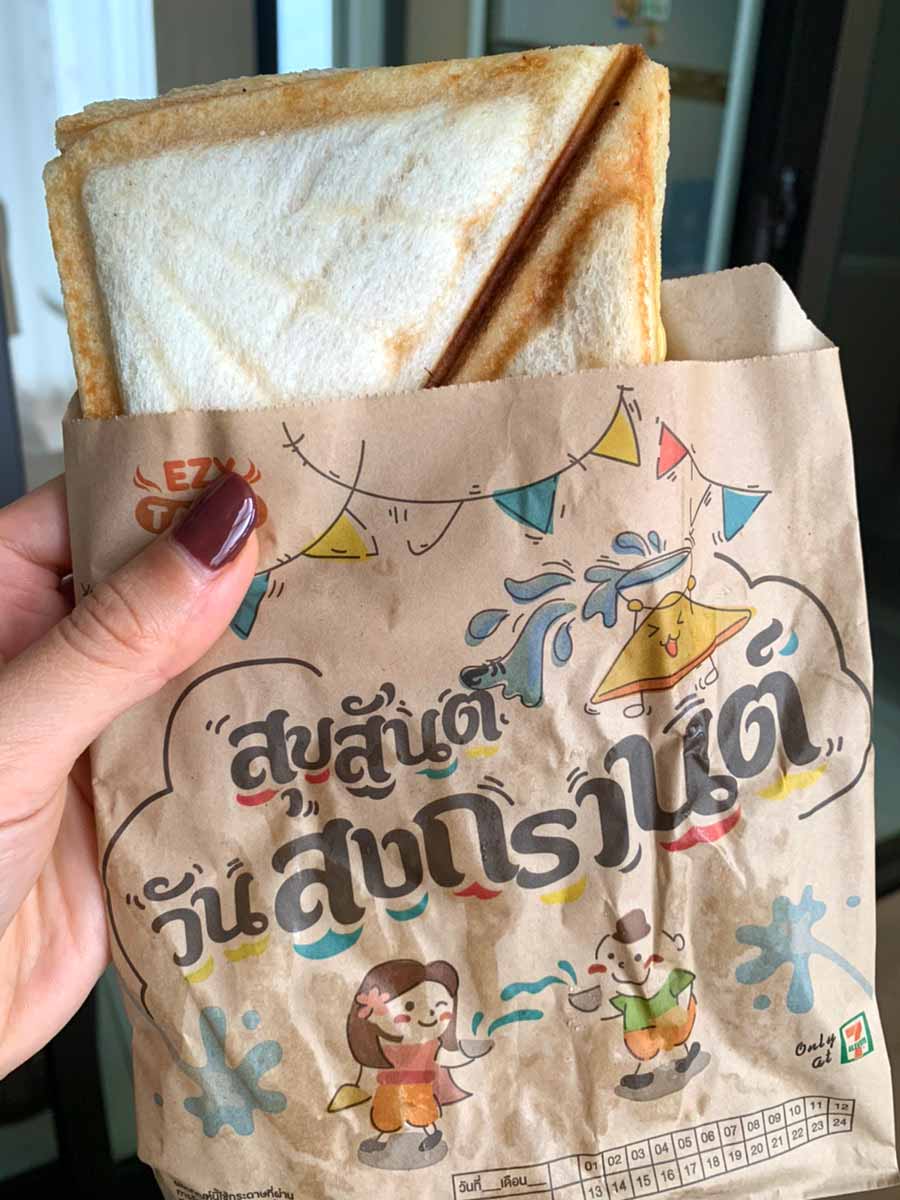 タイのセブンイレブンは、ホットサンドメーカーを使ってその場で焼き上げるホットサンドが大人気。1個30B前後で買えるため、朝食や小腹が空いたときにぴったり。食事系から甘いスイーツ系まで味もさまざまあります。こんがりと焼き上がった熱々のホットサンドは食べる価値ありです。