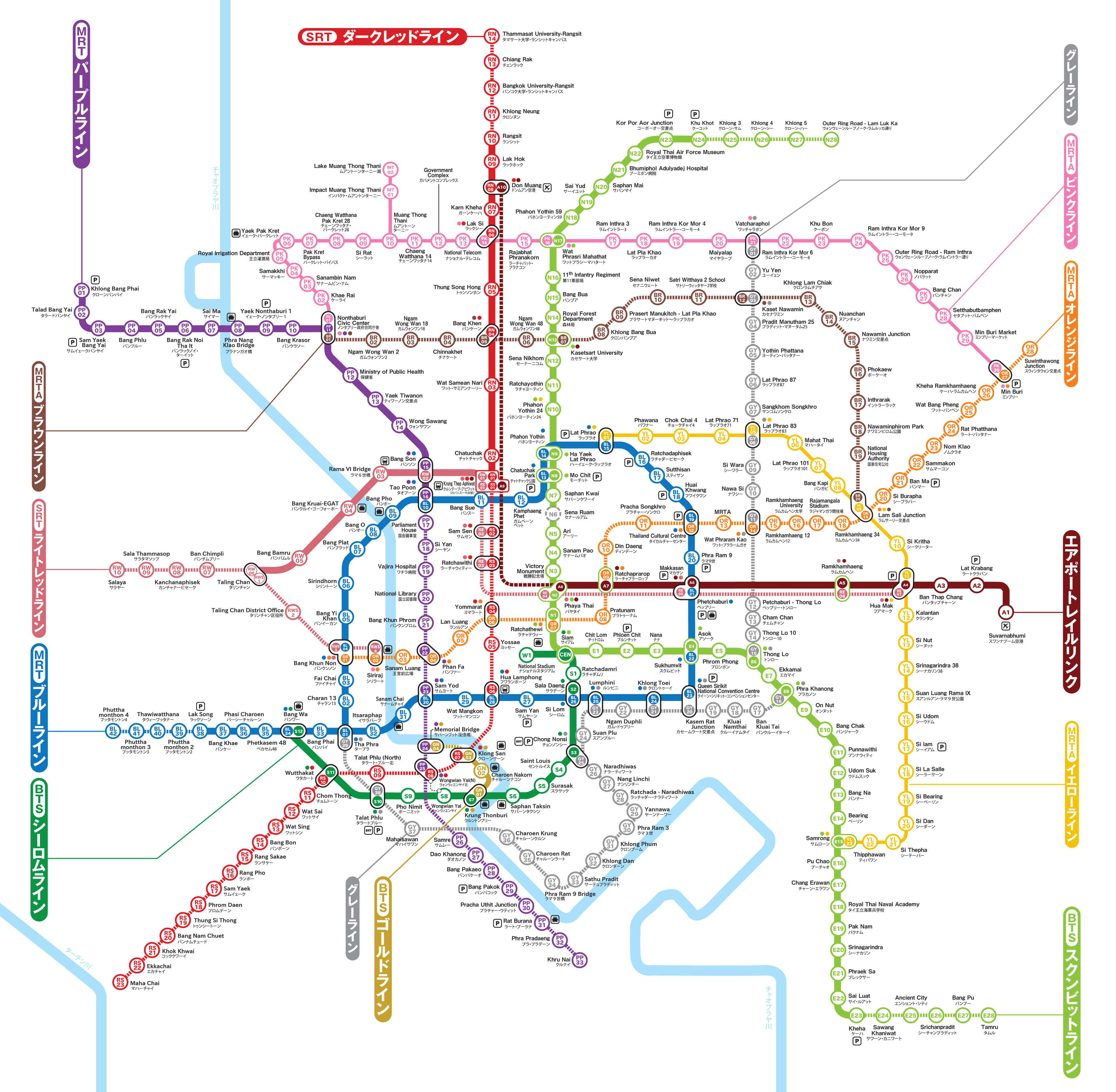 空港から都内まではARL(エアポート・レールリンク)が走り、バンコク中心部ではBTS(高架鉄道)とMRT(地下鉄・高架鉄道)が主要エリアを走ります。
