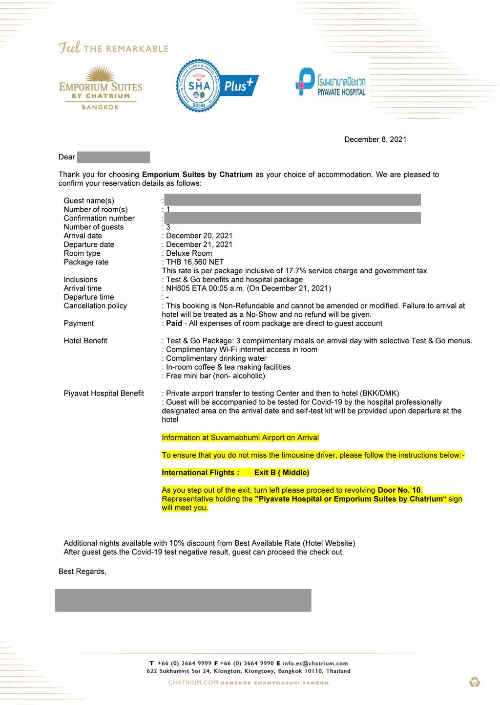 健康安全基準(SHA+)または代替検疫施設(AQ)ホテル1泊分の予約確認書