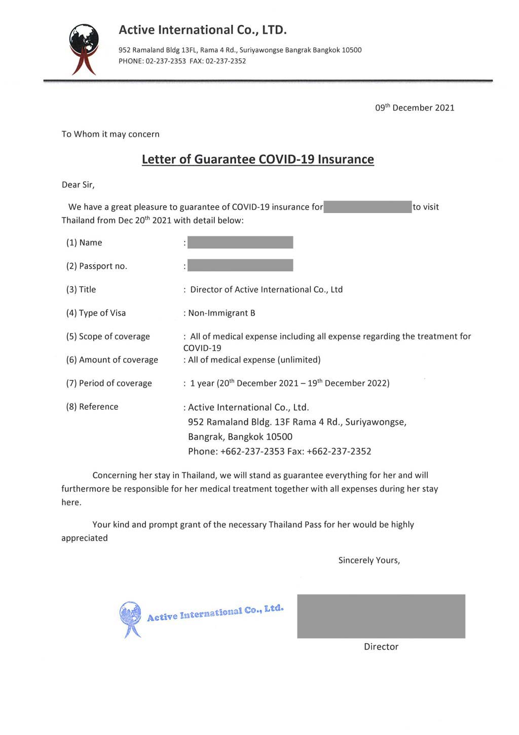 - 新型コロナウイルス感染症治療費等を含む2万米ドル以上の治療補償額のギャランティレター(英文)