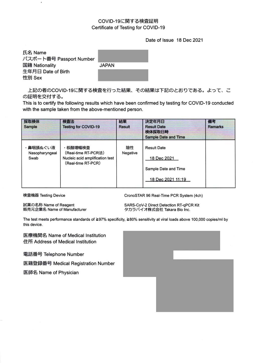 渡航前の72時間以内に、海外渡航用証明書を発行しているクリニックでPCR検査を受けてください。