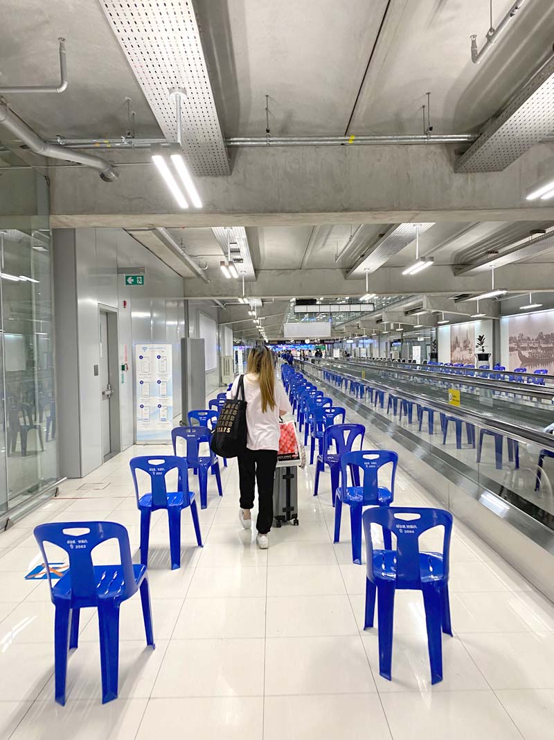 スワンナプーム国際空港に着いて飛行機を降りると、イミグレーションの手前にズラッと並べられた椅子に案内され、係員により入国書類の確認が行われました。