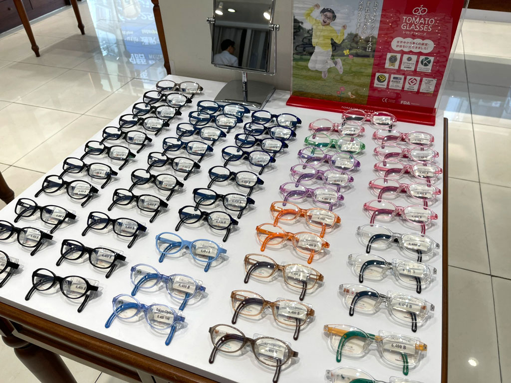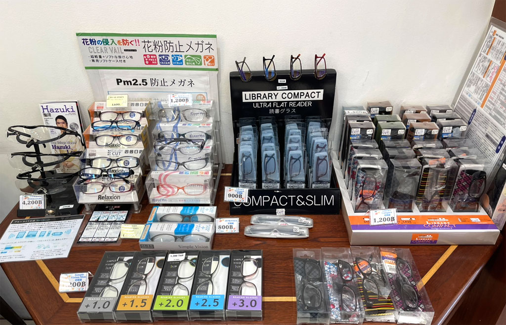 同店で取り扱うメガネは年齢や用途、生活スタイルなどに応じて、近視用、乱視用のメガネはもちろんのこと、老眼鏡やタイでは調整の難しい遠近両用レンズを作ることができる。パソコンやスマホの利用時の目の負担を軽くするブルーライトレンズ、バンコクの強い日差しから目を守る調光レンズや偏光レンズ、ゴルフ用サングラス(度付きも可)、デザインと機能性を重視した最新の子ども用メガネなど、豊富なラインナップ。