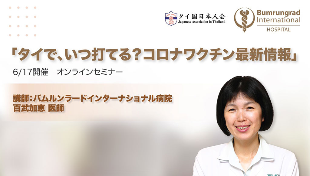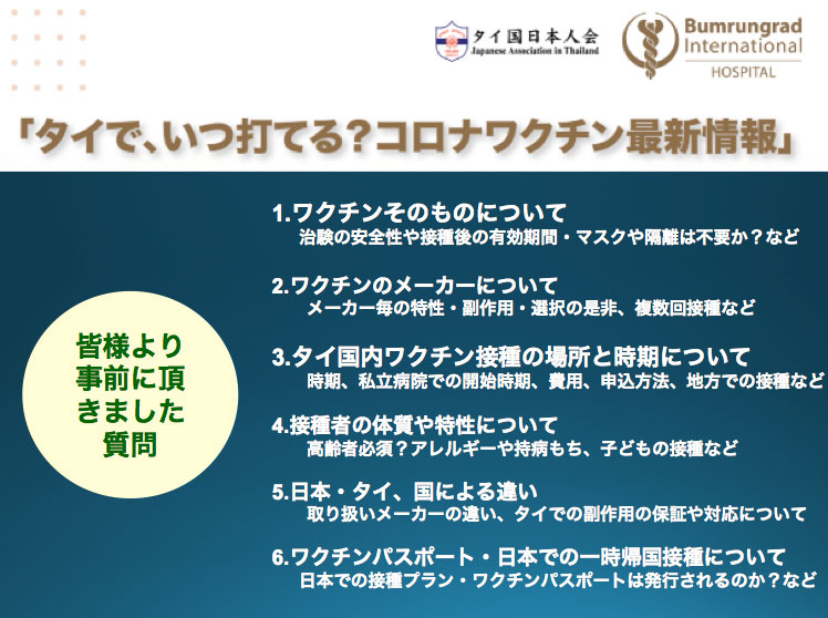 こうした在タイ日本人の声に応えるべく、「タイ国日本人会」「バムルンラード・インターナショナル病院」は去る6月17日、【タイで、いつ打てる? コロナワクチン最新情報】と題したオンラインセミナーを開催。