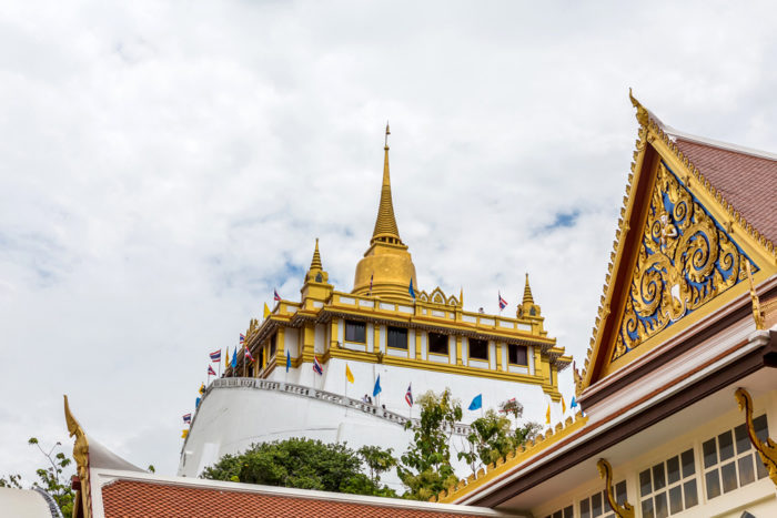 344段の螺旋階段の先にある頂上からは、バンコクの街並みを一望することができ、夕日に染まる美しい黄金の大仏塔(チェディ)を見ることができます。