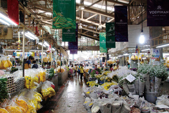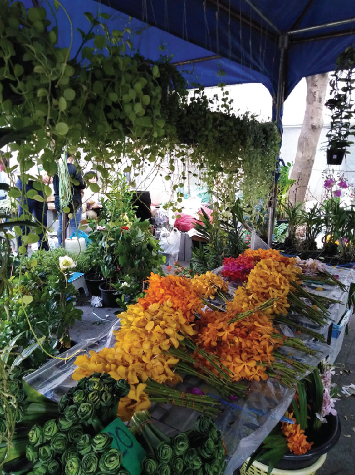 チャオプラヤー川から運搬されてきた商材が並ぶ、24時間営業の花専門市場。