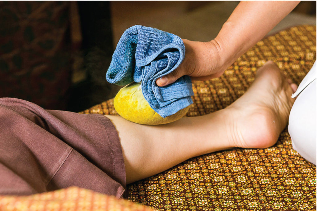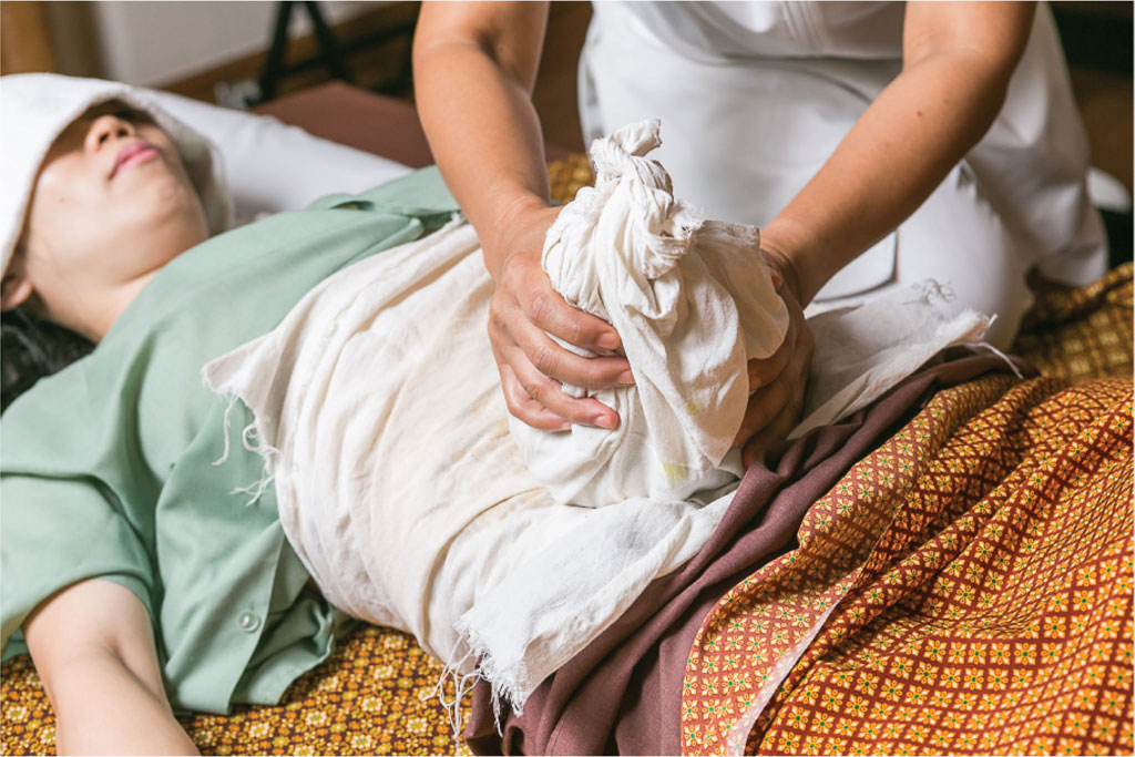 - ハーブを包んだ布を全身にゆっくりと押し当て、筋肉の緊張を解く